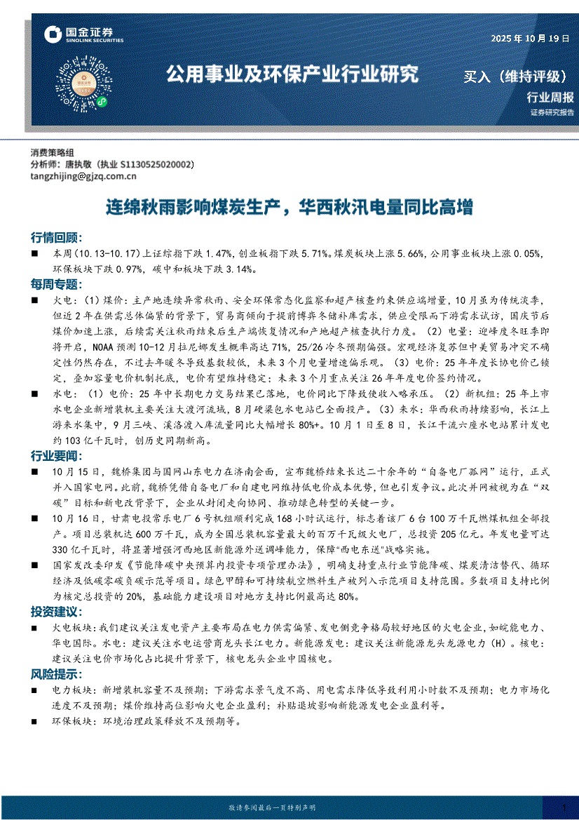 公用事业及环保产业行业研报:国金证券-公用事业及环保产业行业周报:连绵秋雨影响煤炭生产,华西秋汛电量同比高增-251019