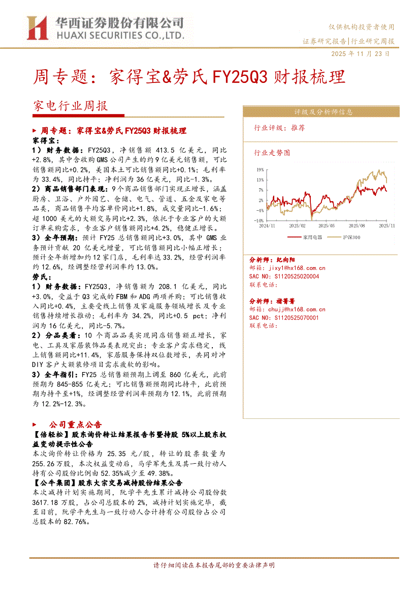 家电行业研报:华西证券-家电行业周报:周专题,家得宝&劳氏FY25Q3财报梳理-251123