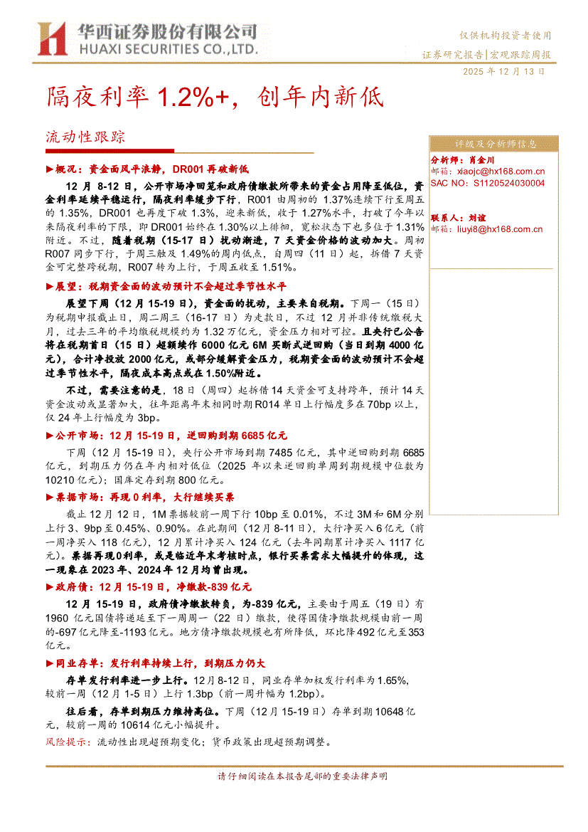 研报:华西证券-流动性跟踪:隔夜利率1.2%+,创年内新低-251213