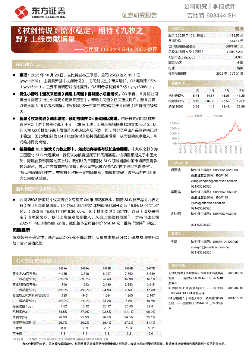 吉比特研报:东方证券-吉比特-603444-25Q3点评:《杖剑传说》流水稳定,期待《九牧之野》上线贡献增量-251031