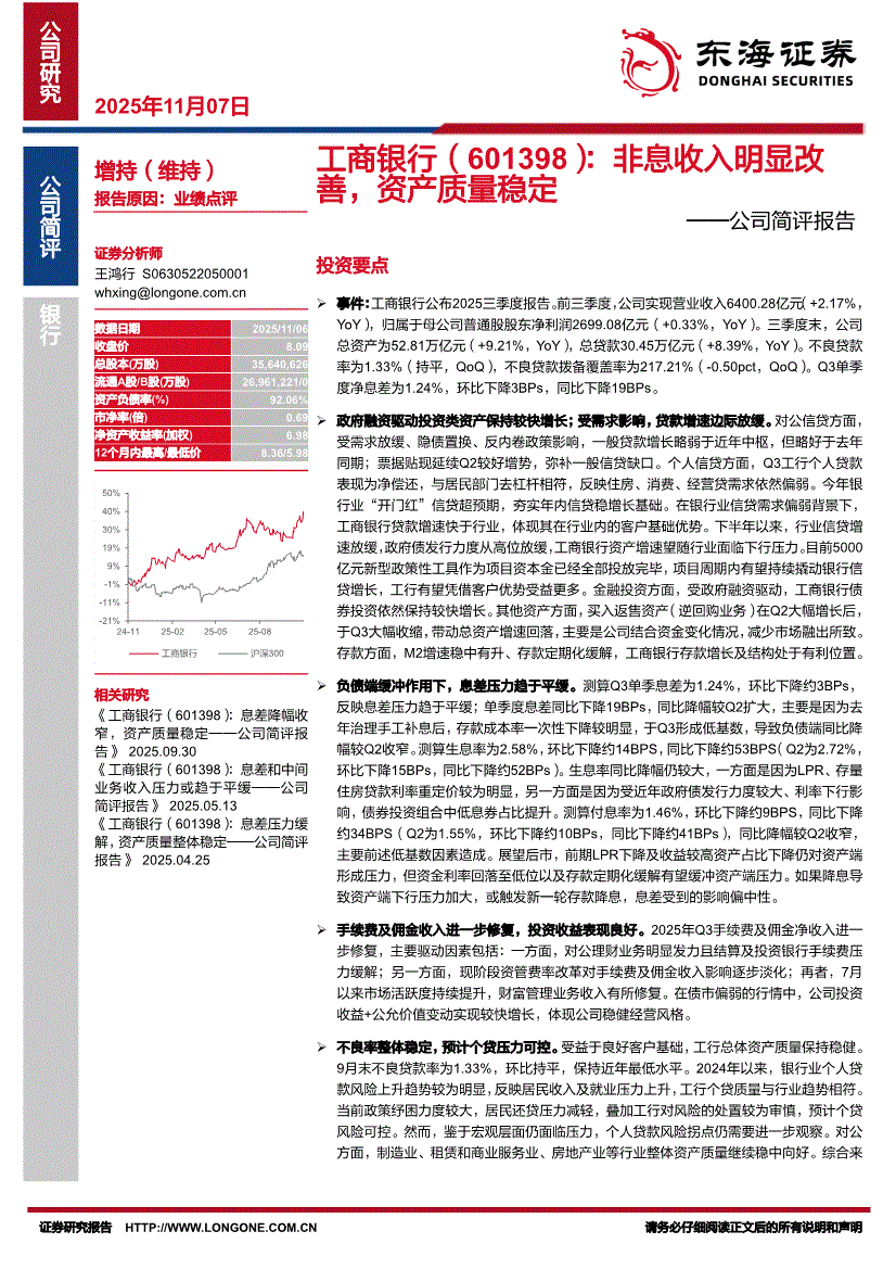 工商银行研报:东海证券-工商银行-601398-公司简评报告:非息收入明显改善,资产质量稳定-251107
