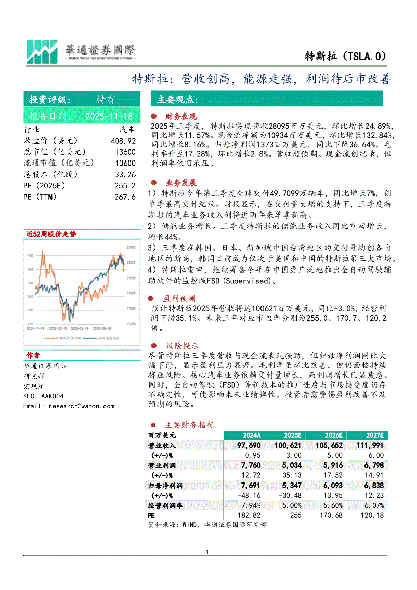 特斯拉研报:华通证券国际-特斯拉-TSLA.US-营收创高,能源走强,利润待后市改善-251118
