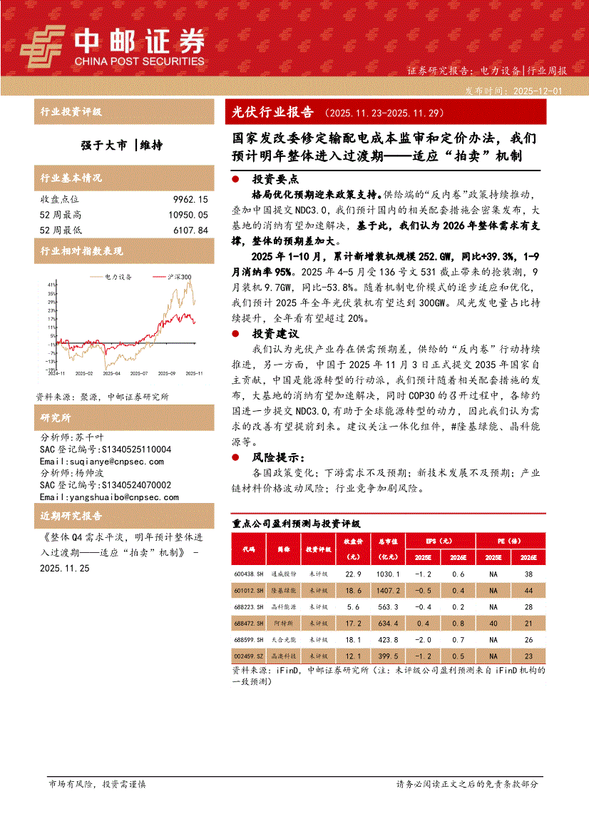 光伏行业研报:中邮证券-光伏行业周报:国家发改委修定输配电成本监审和定价办法,我们预计明年整体进入过渡期——适应“拍卖”机制-251201