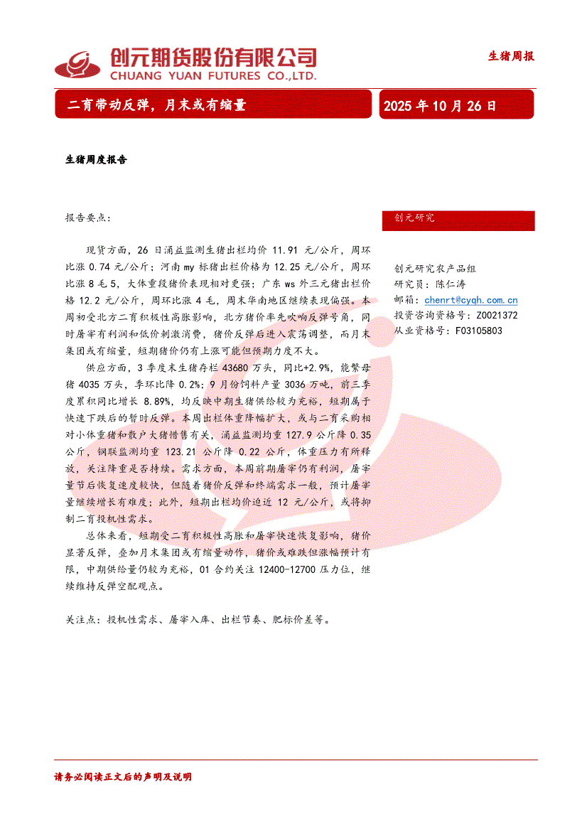 研报:创元期货-生猪周度报告:二育带动反弹,月末或有缩量-251026