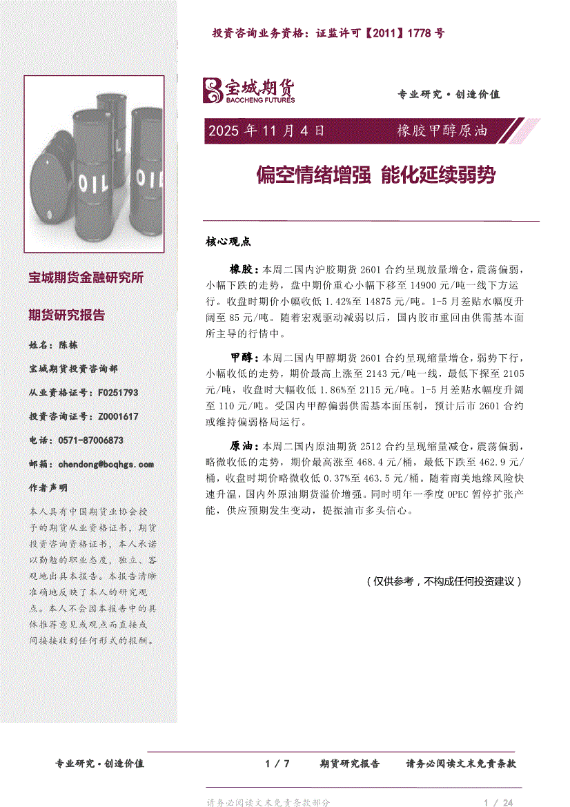 研报:宝城期货-橡胶甲醇原油日报:偏空情绪增强,能化延续弱势-251104