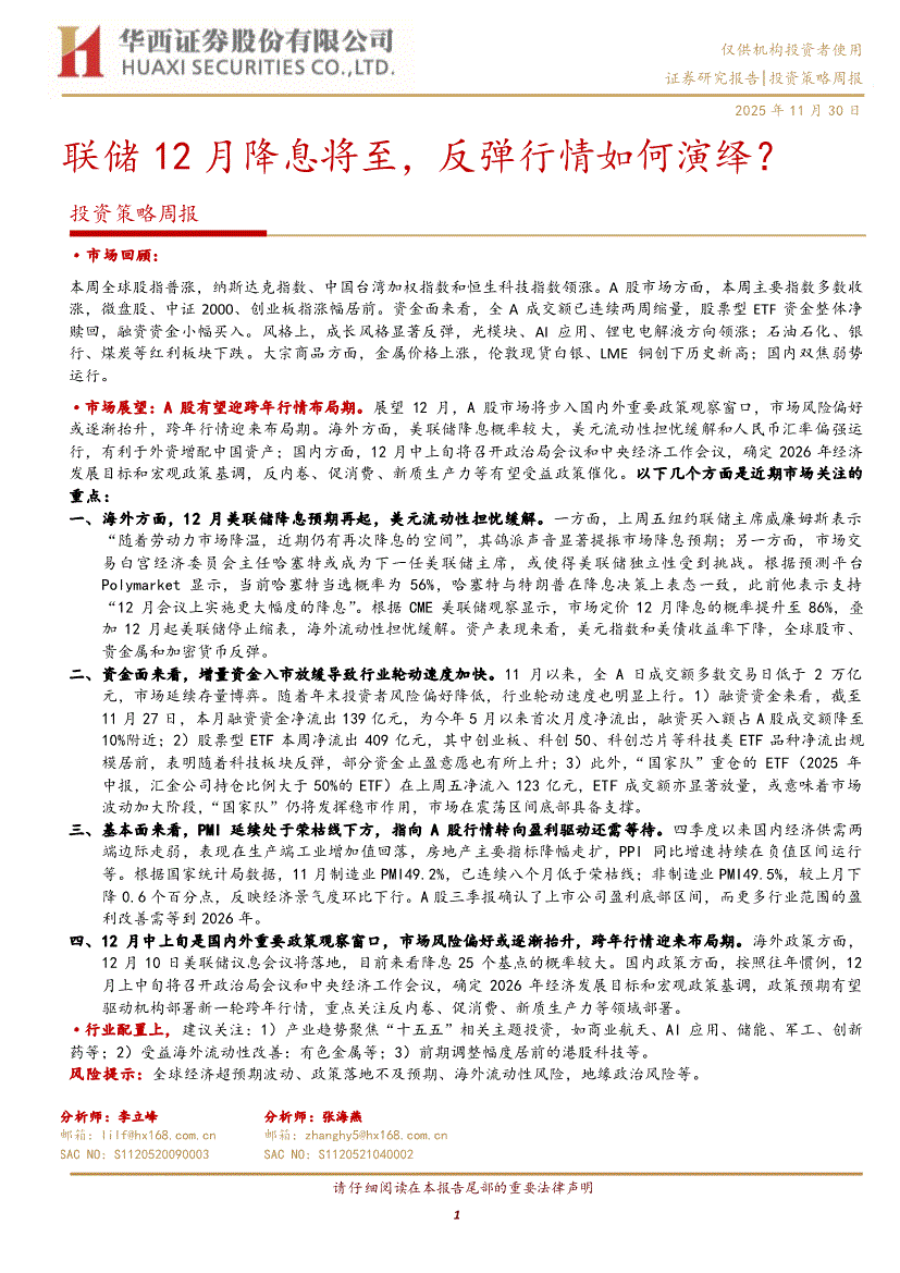 研报:华西证券-投资策略周报:联储12月降息将至,反弹行情如何演绎?-251130