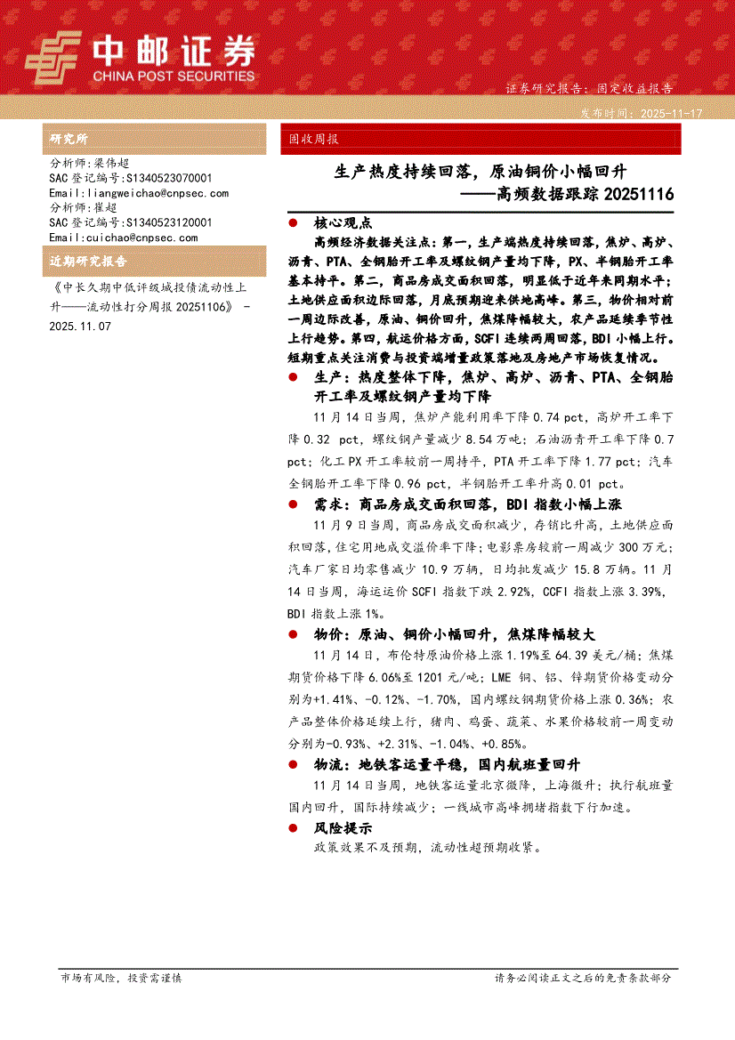 中邮证券-高频数据跟踪:生产热度持续回落,原油铜价小幅回升-251117