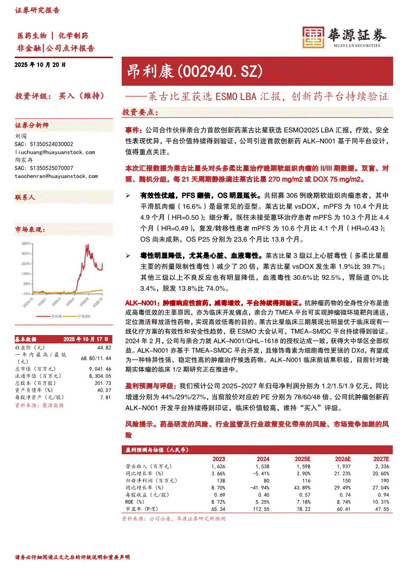 昂利康研报:华源证券-昂利康-002940-莱古比星获选ESMO LBA汇报,创新药平台持续验证-251020