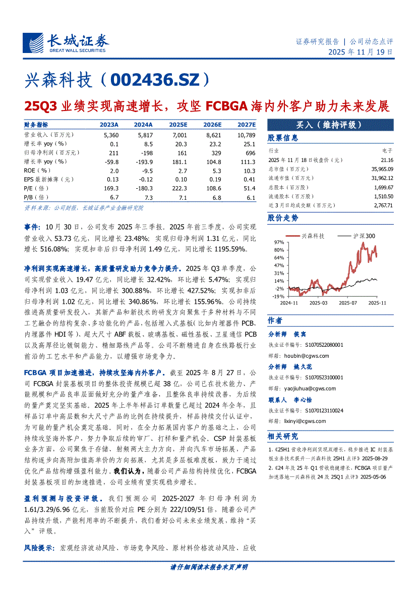 兴森科技研报:长城证券-兴森科技-002436-25Q3业绩实现高速增长,攻坚FCBGA海内外客户助力未来发展-251119