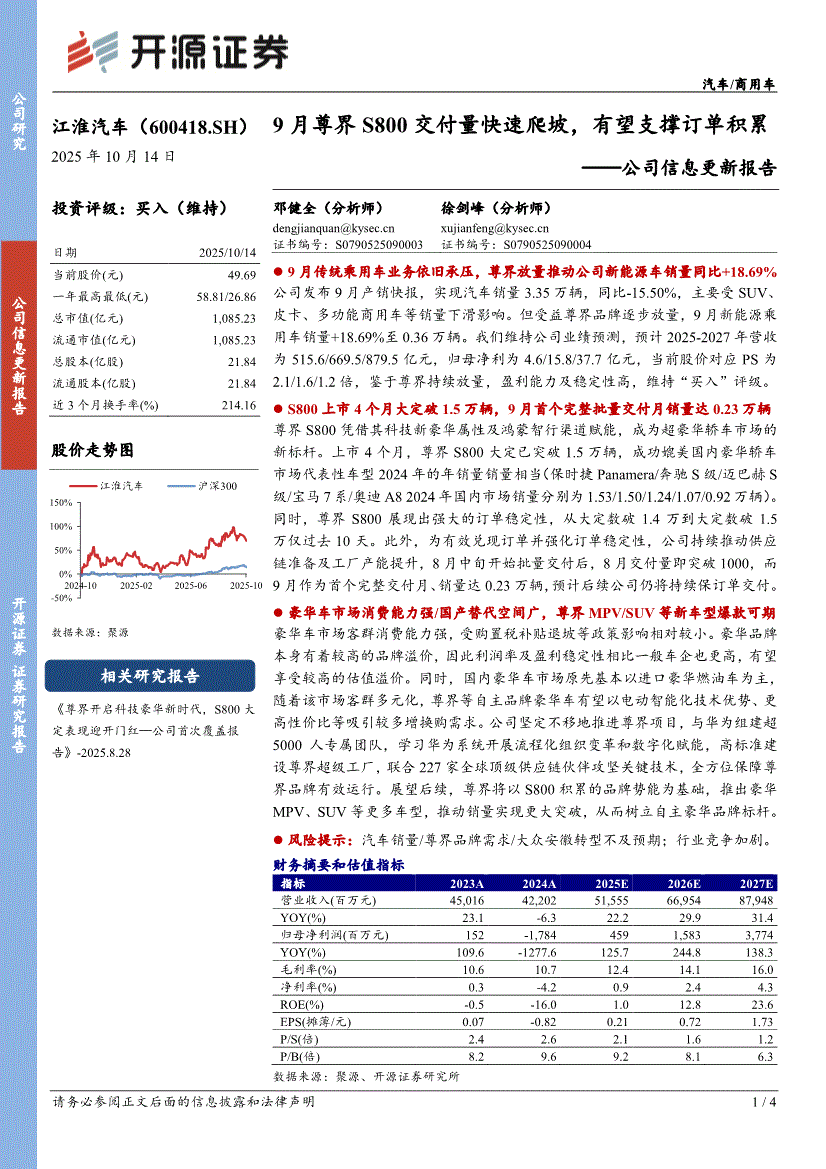 江淮汽车研报:开源证券-江淮汽车-600418-公司信息更新报告:9月尊界S800交付量快速爬坡,有望支撑订单积累-251014