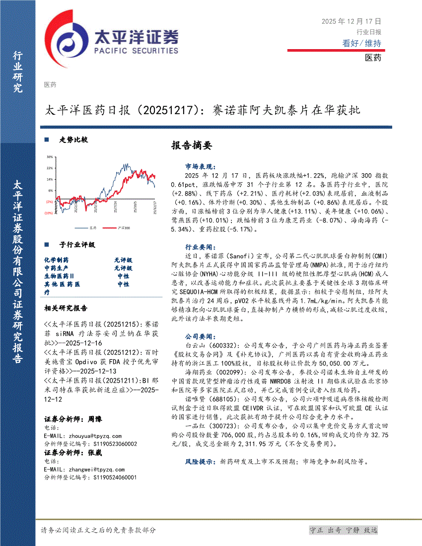 医药行业研报:太平洋证券-医药行业日报(20251217):赛诺菲阿夫凯泰片在华获批-251217