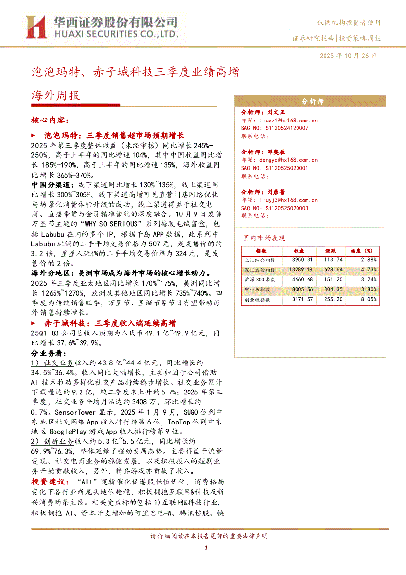 研报:华西证券-海外周报:泡泡玛特、赤子城科技三季度业绩高增-251026