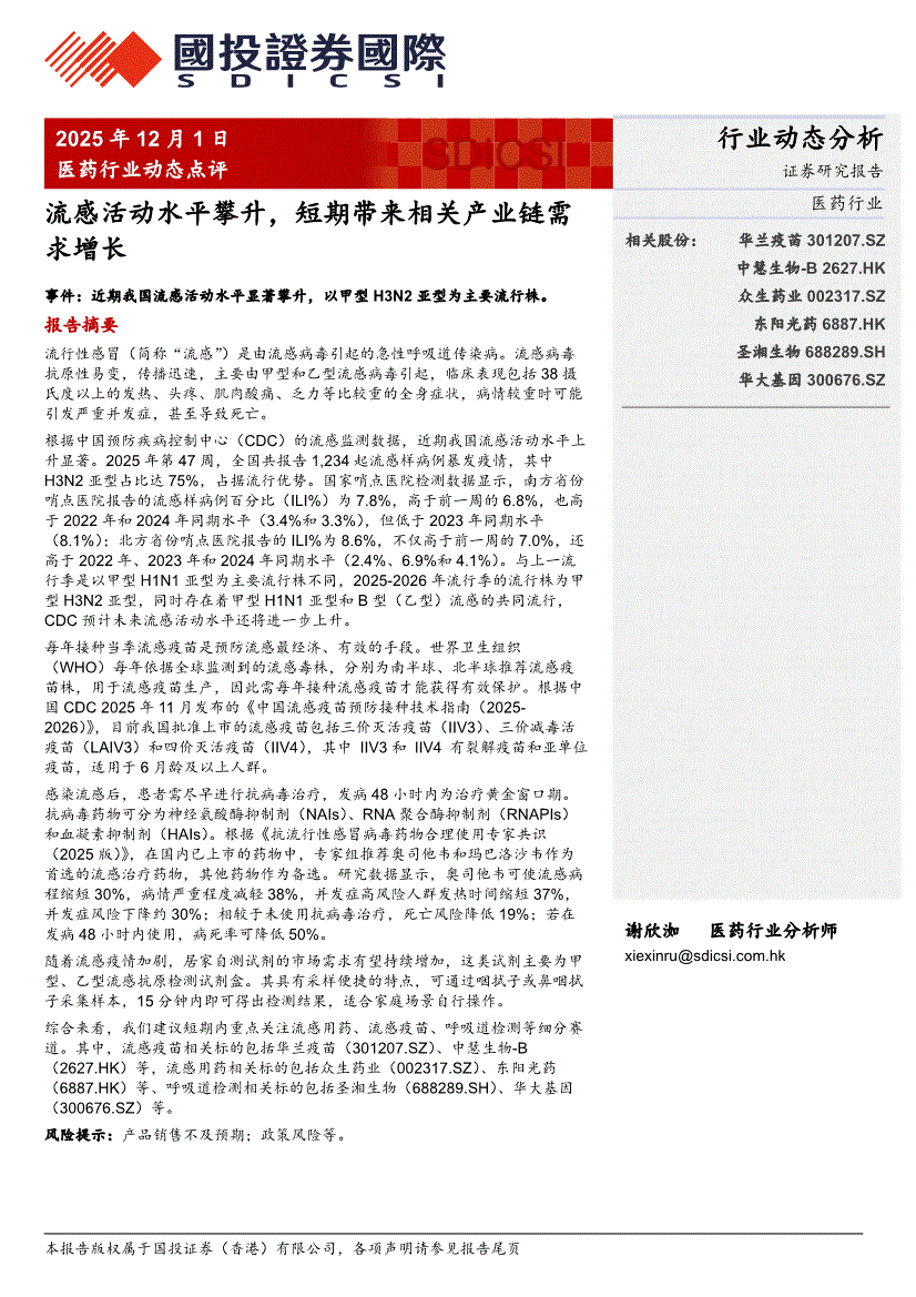 研报:国投证券(香港)-医药行业动态:流感活动水平攀升,短期带来相关产业链需求增长-251201