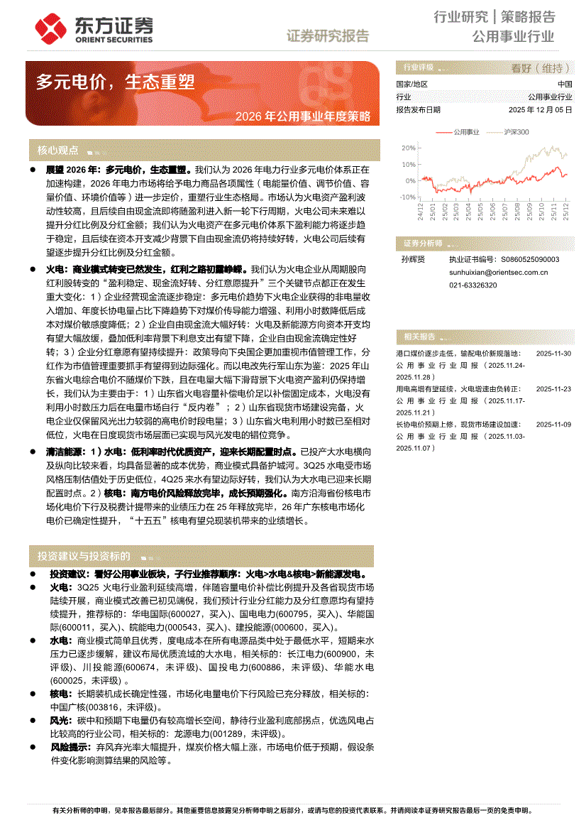 公用事业行业研报:东方证券-2026年公用事业行业年度策略:多元电价,生态重塑-251205