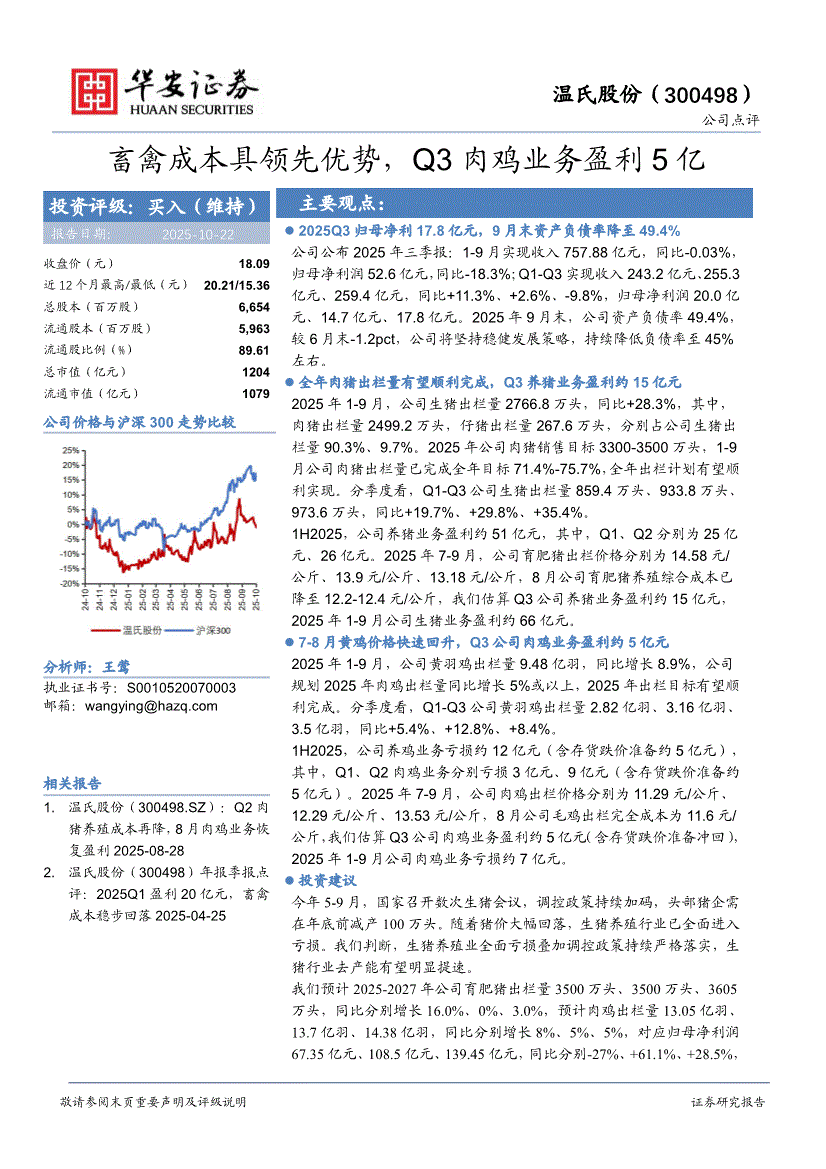 温氏股份研报:华安证券-温氏股份-300498-畜禽成本具领先优势,Q3肉鸡业务盈利5亿-251022