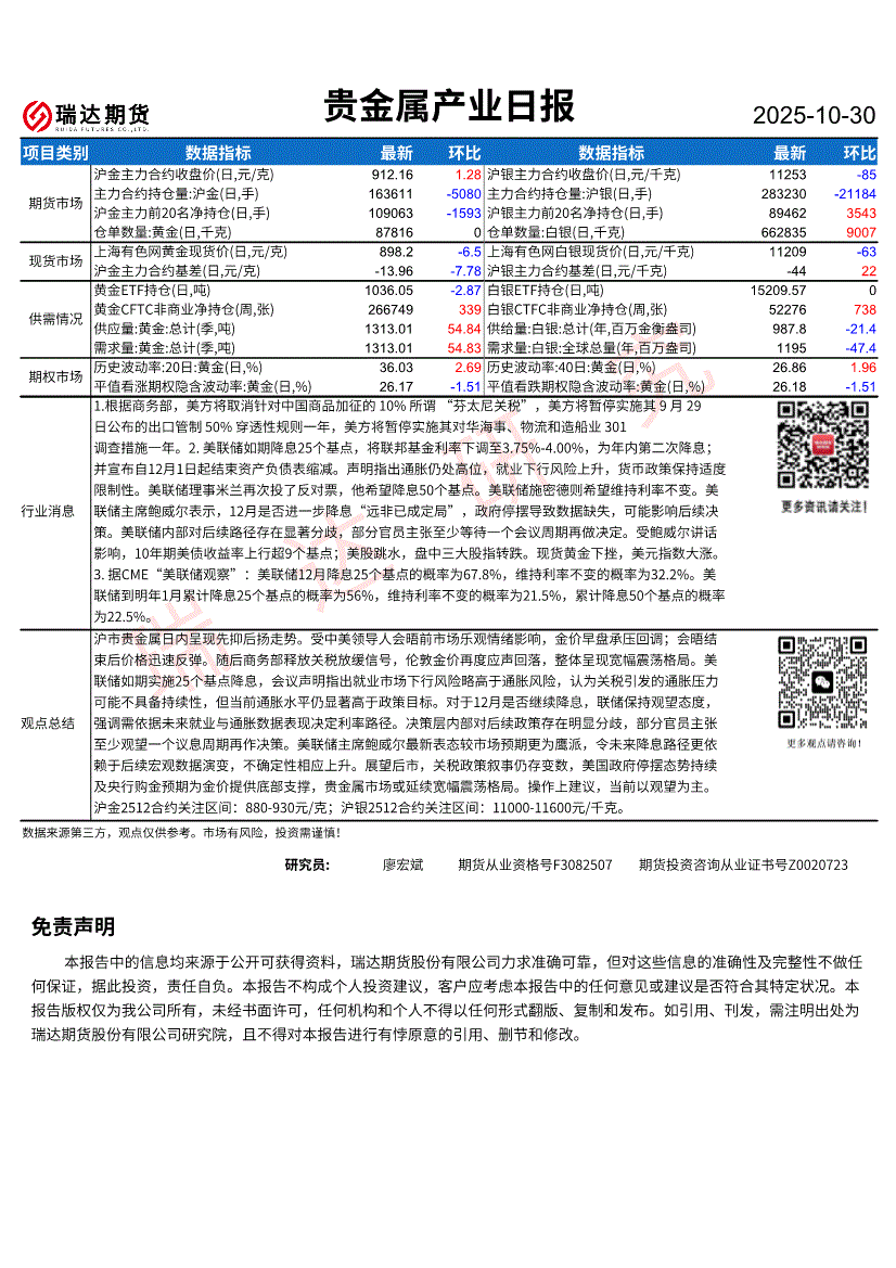 研报:瑞达期货-贵金属产业日报-251030