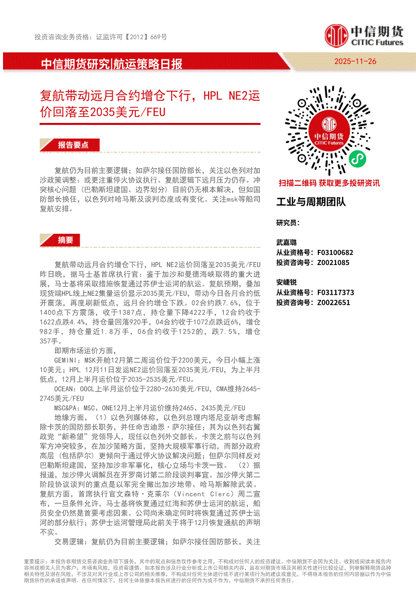 研报:中信期货-航运策略日报:复航带动远月合约增仓下行,HPL NE2运价回落至2035美元/FEU-251126