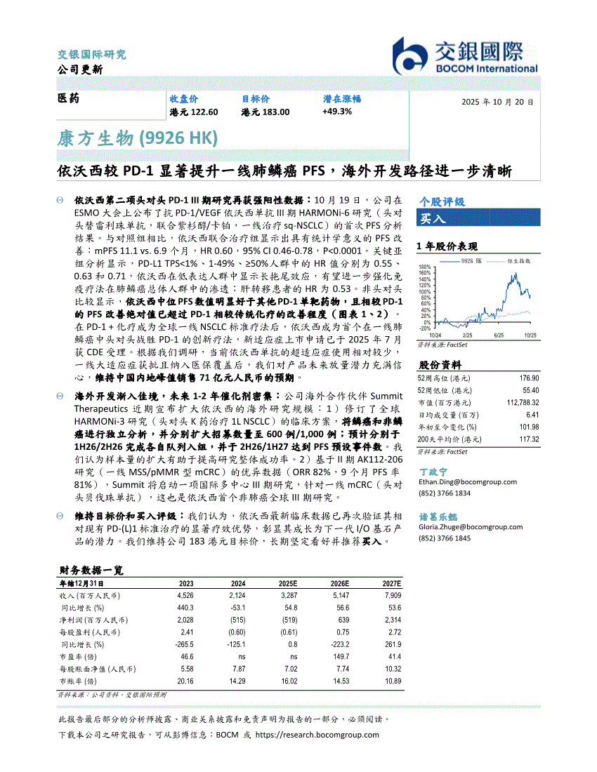 康方生物研报:交银国际-康方生物-9926.HK-依沃西较PD~1显著提升一线肺鳞癌PFS,海外开发路径进一步清晰-251020