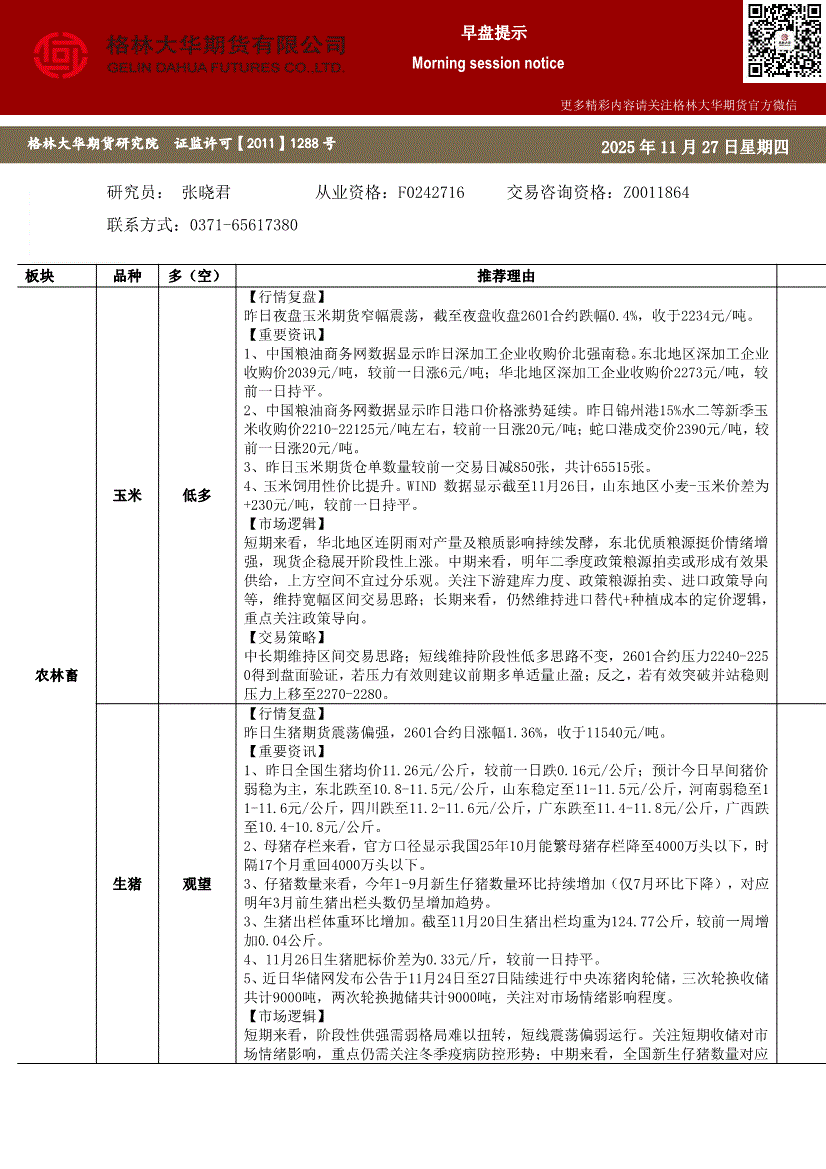 研报:格林大华期货-玉米生猪鸡蛋早盘提示-251127