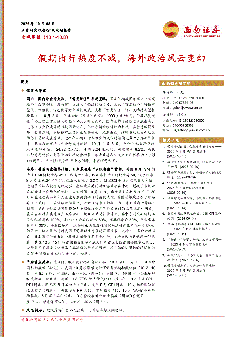 研报:西南证券-宏观周报:假期出行热度不减,海外政治风云变幻-251008