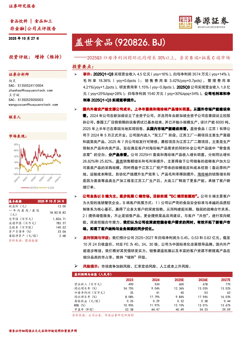 盖世食品研报:华源证券-盖世食品-920826-2025Q3归母净利润同环比均增长30%以上,夯实B端+拓展C端市场-251027