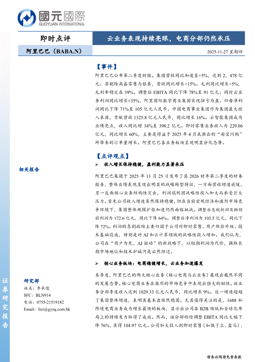 阿里巴巴研报:国元国际-阿里巴巴-BABA.US-云业务表现持续亮眼,电商分部仍然承压-251127