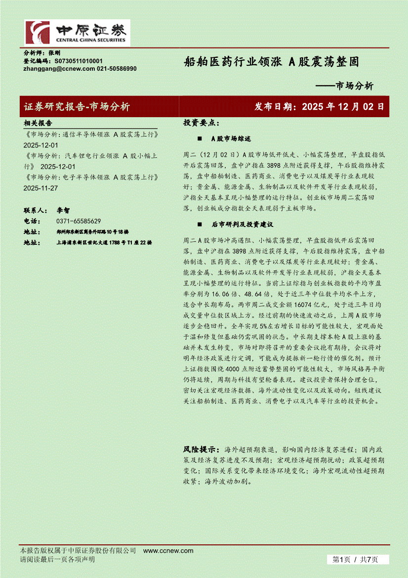 研报:中原证券-市场分析:船舶医药行业领涨,A股震荡整固-251202