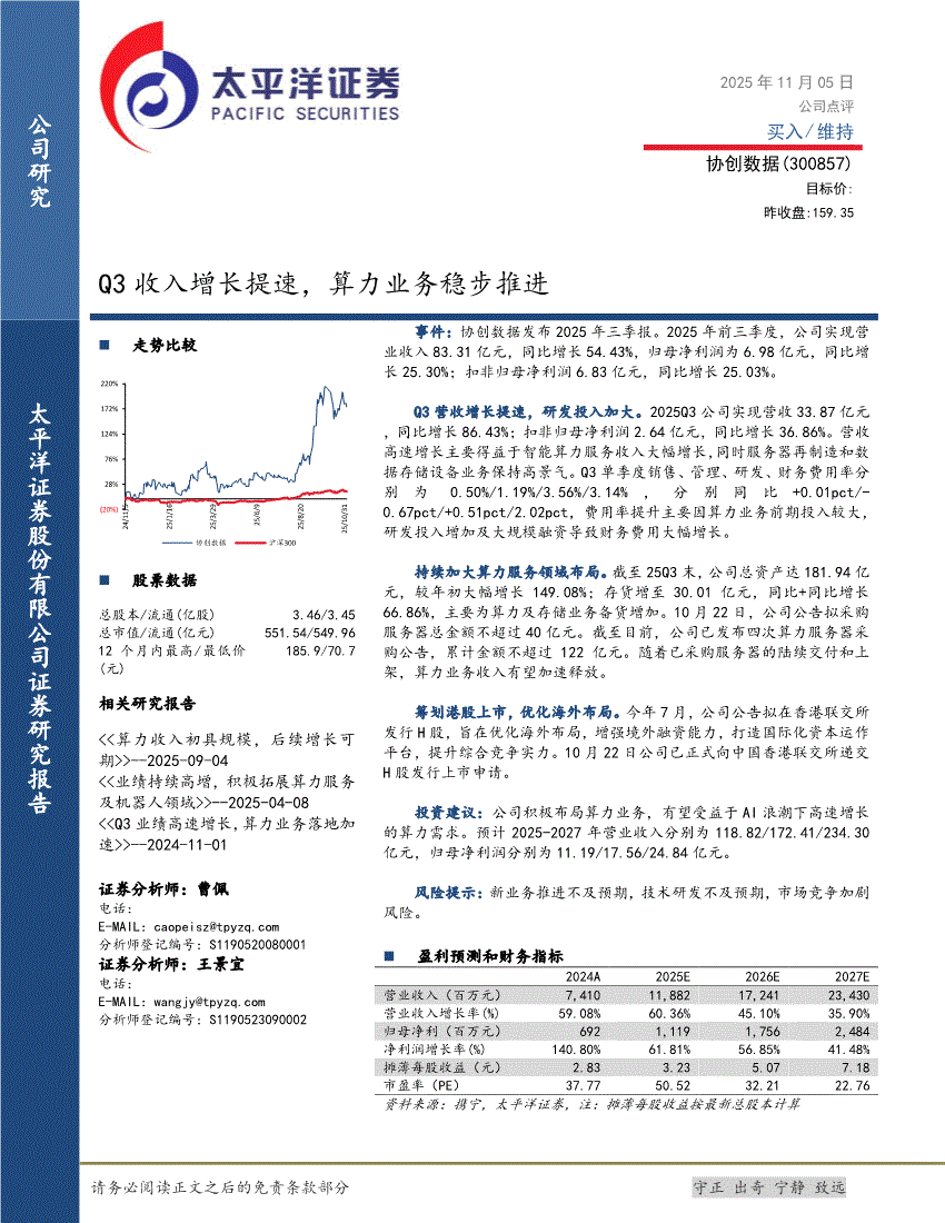 协创数据研报:太平洋证券-协创数据-300857-Q3收入增长提速,算力业务稳步推进-251105