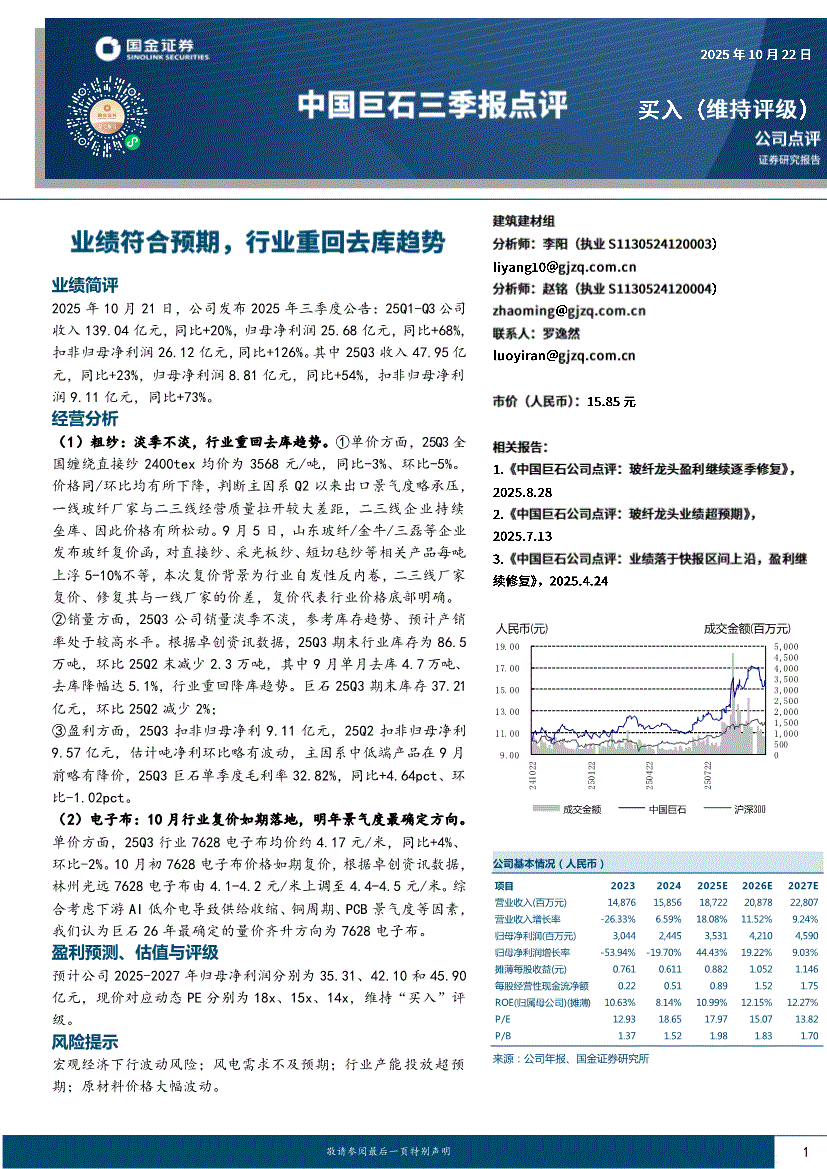 中国巨石研报:国金证券-中国巨石-600176-业绩符合预期,行业重回去库趋势-251022