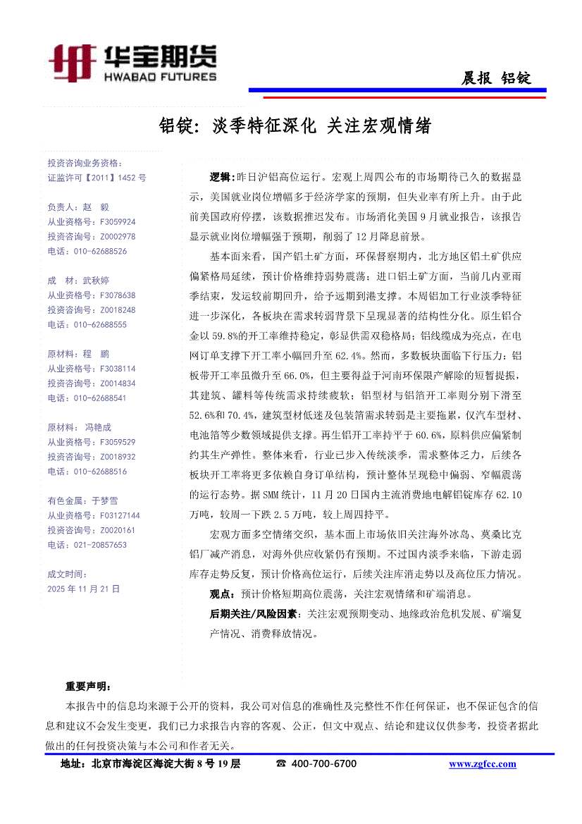 研报:华宝期货-铝锭晨报:淡季特征深化,关注宏观情绪-251121