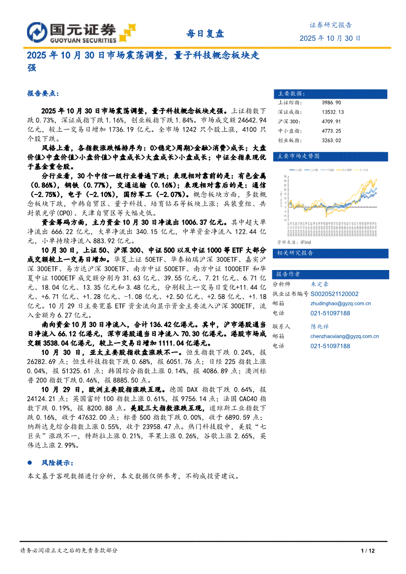 研报:国元证券-每日复盘:2025年10月30日市场震荡调整,量子科技概念板块走强-251030