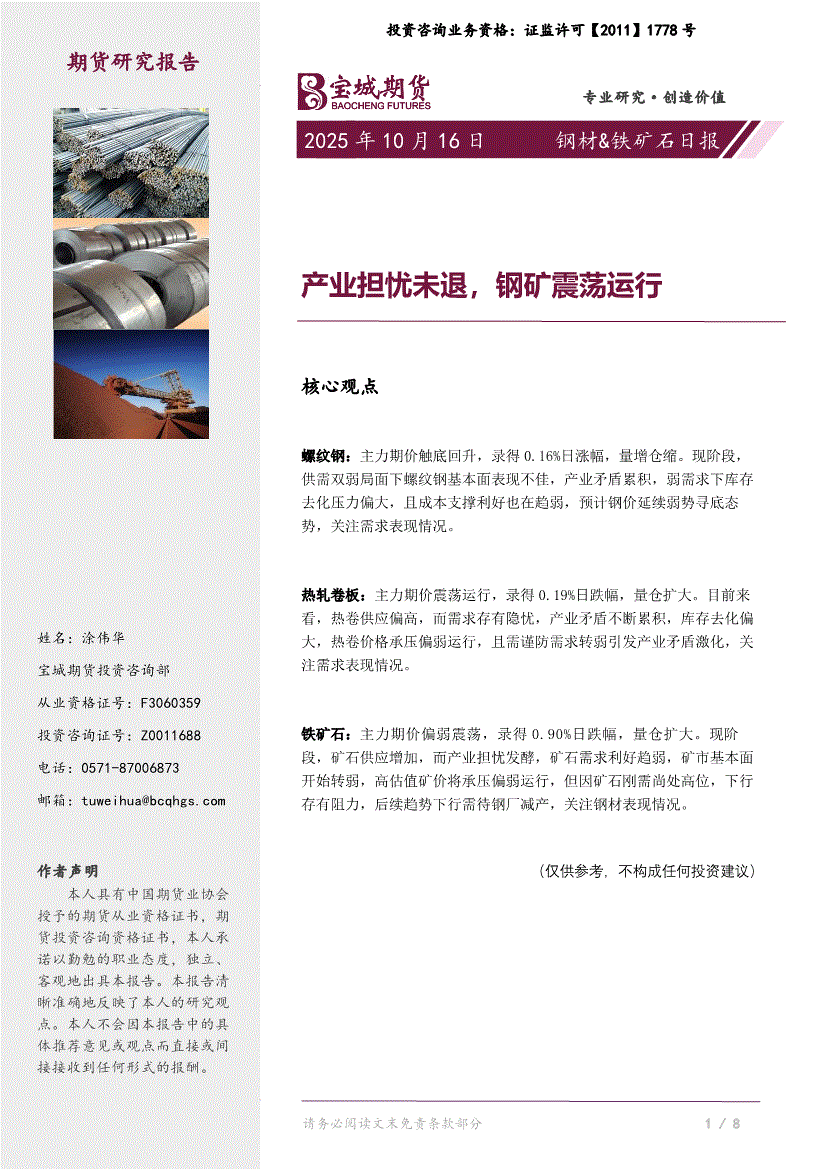 研报:宝城期货-钢材&铁矿石日报:产业担忧未退,钢矿震荡运行-251016