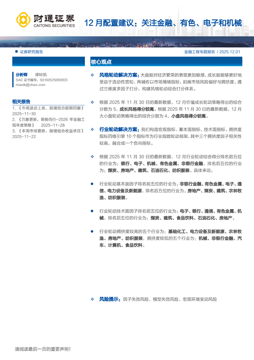 研报:财通证券-12月配置建议:关注金融、有色、电子和机械-251201