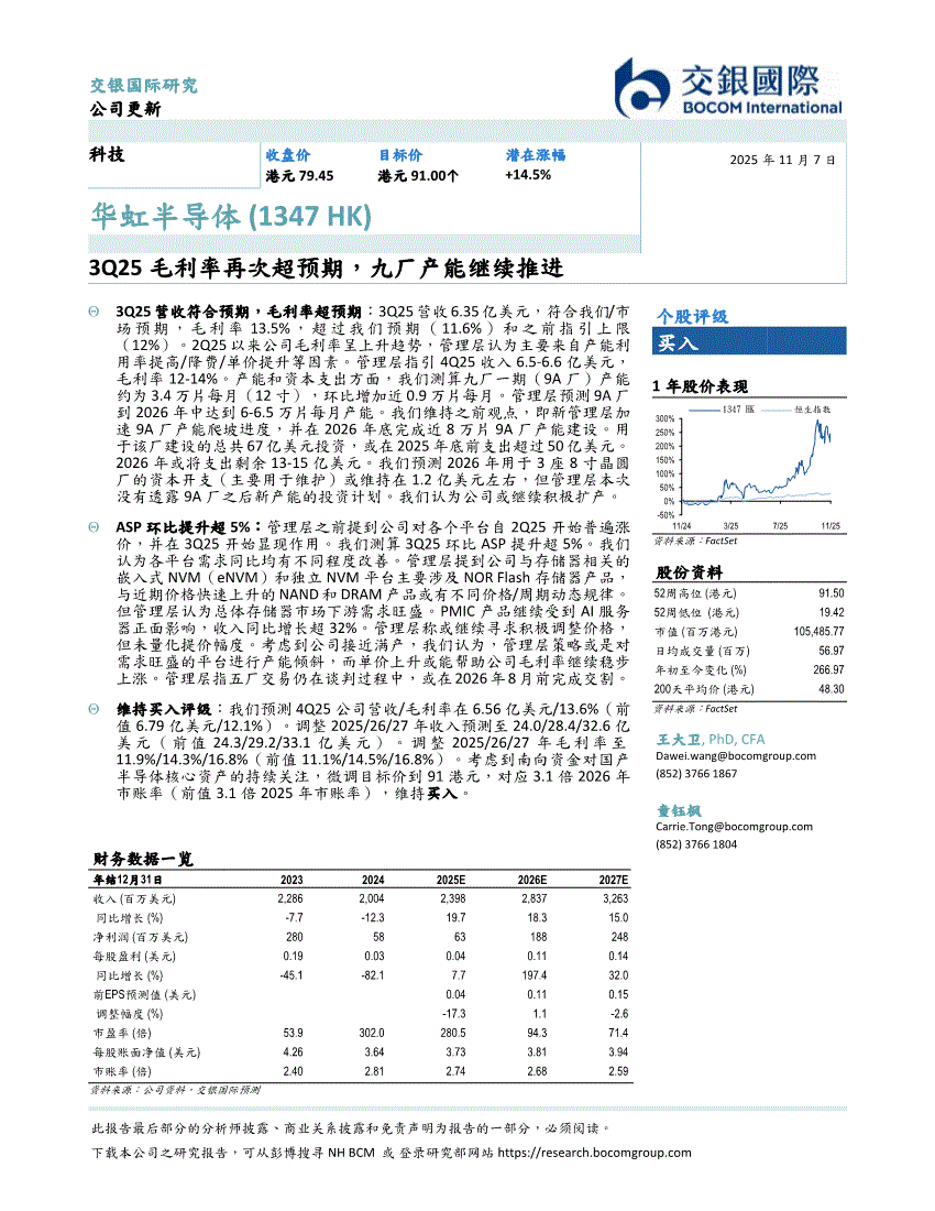 华虹半导体研报:交银国际-华虹半导体-1347.HK-3Q25毛利率再次超预期,九厂产能继续推进-251107