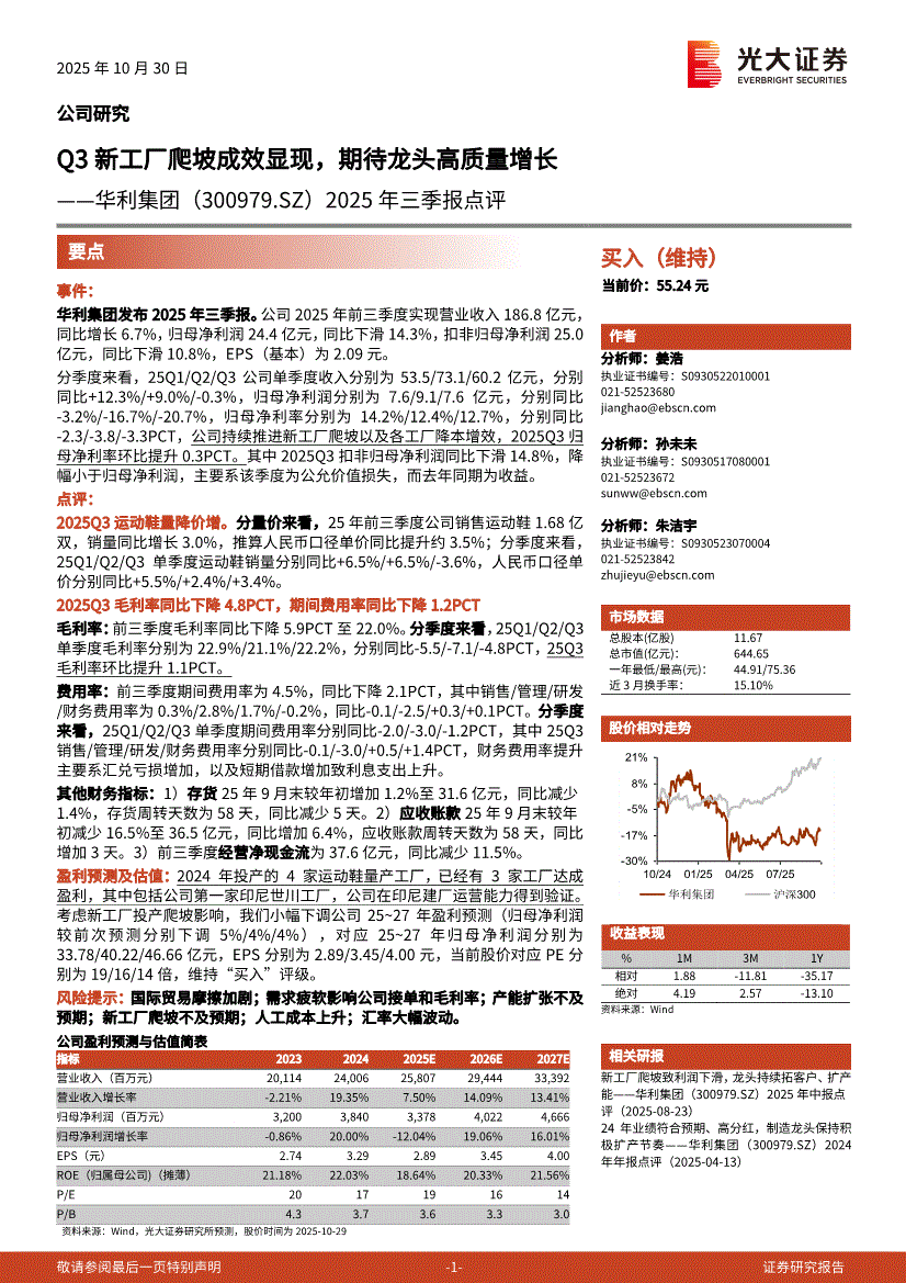 华利集团研报:光大证券-华利集团-300979-2025年三季报点评:Q3新工厂爬坡成效显现,期待龙头高质量增长-251030
