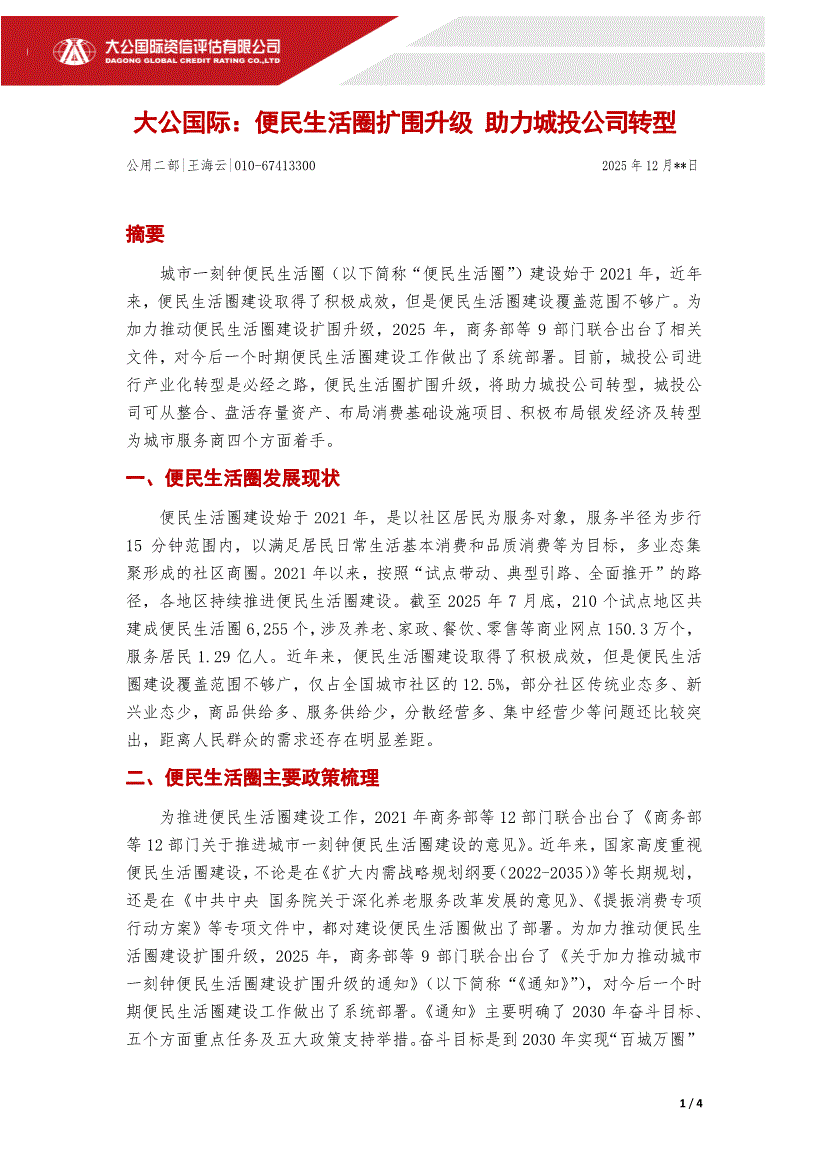 研报:大公国际-便民生活圈扩围升级,助力城投公司转型-251215