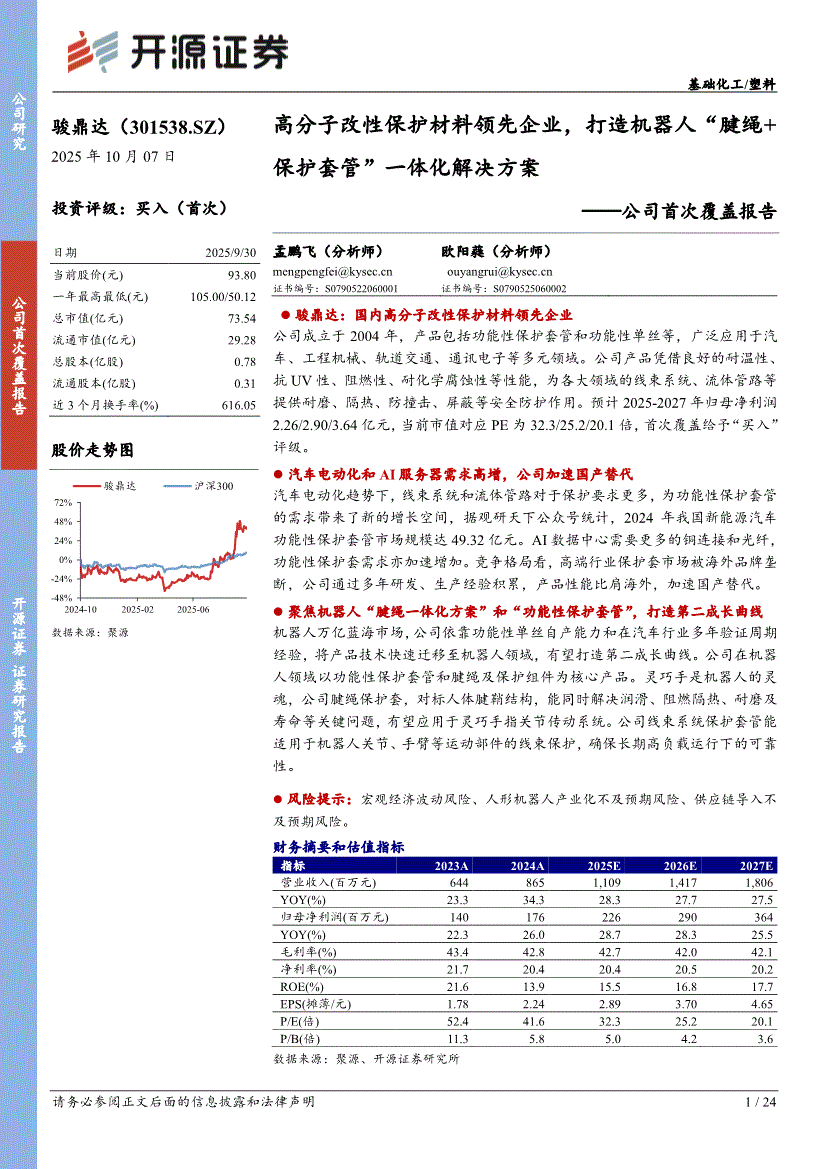 骏鼎达研报:开源证券-骏鼎达-301538-公司首次覆盖报告:高分子改性保护材料领先企业,打造机器人“腱绳+保护套管”一体化解决方案-251007