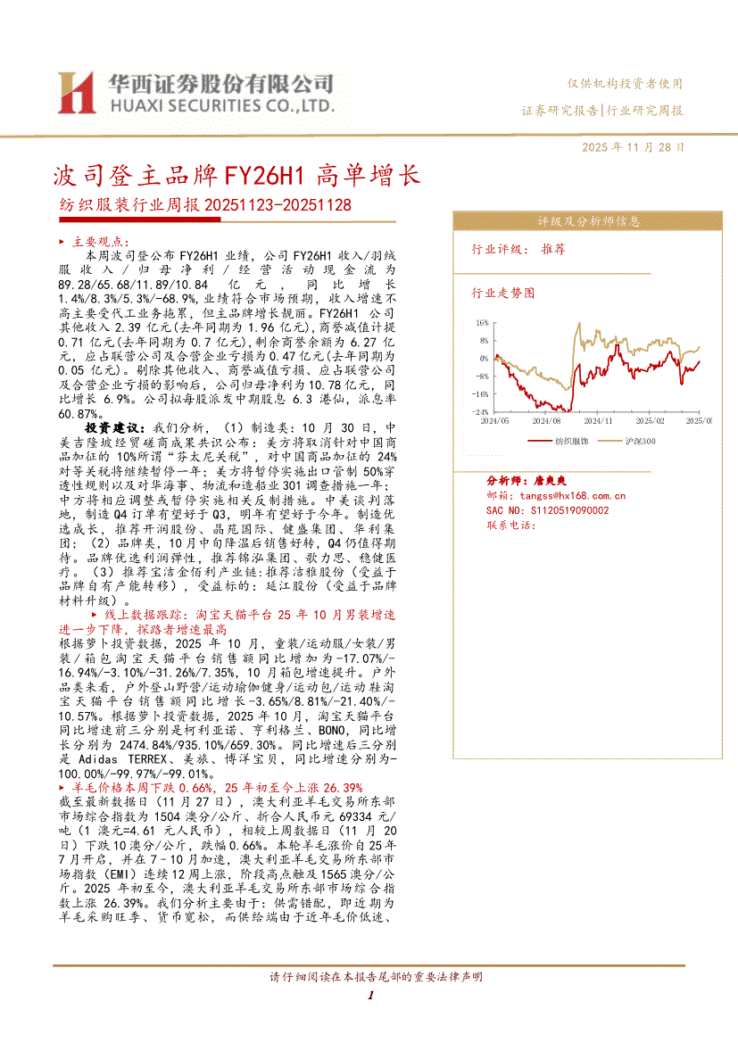 纺织服装行业研报:华西证券-纺织服装行业周报:波司登主品牌FY26H1高单增长-251128