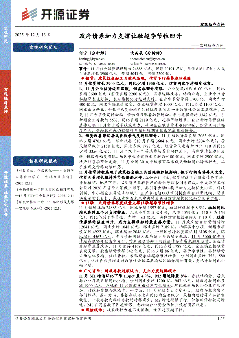 研报:开源证券-宏观经济点评:政府债券加力支撑社融超季节性回升-251213