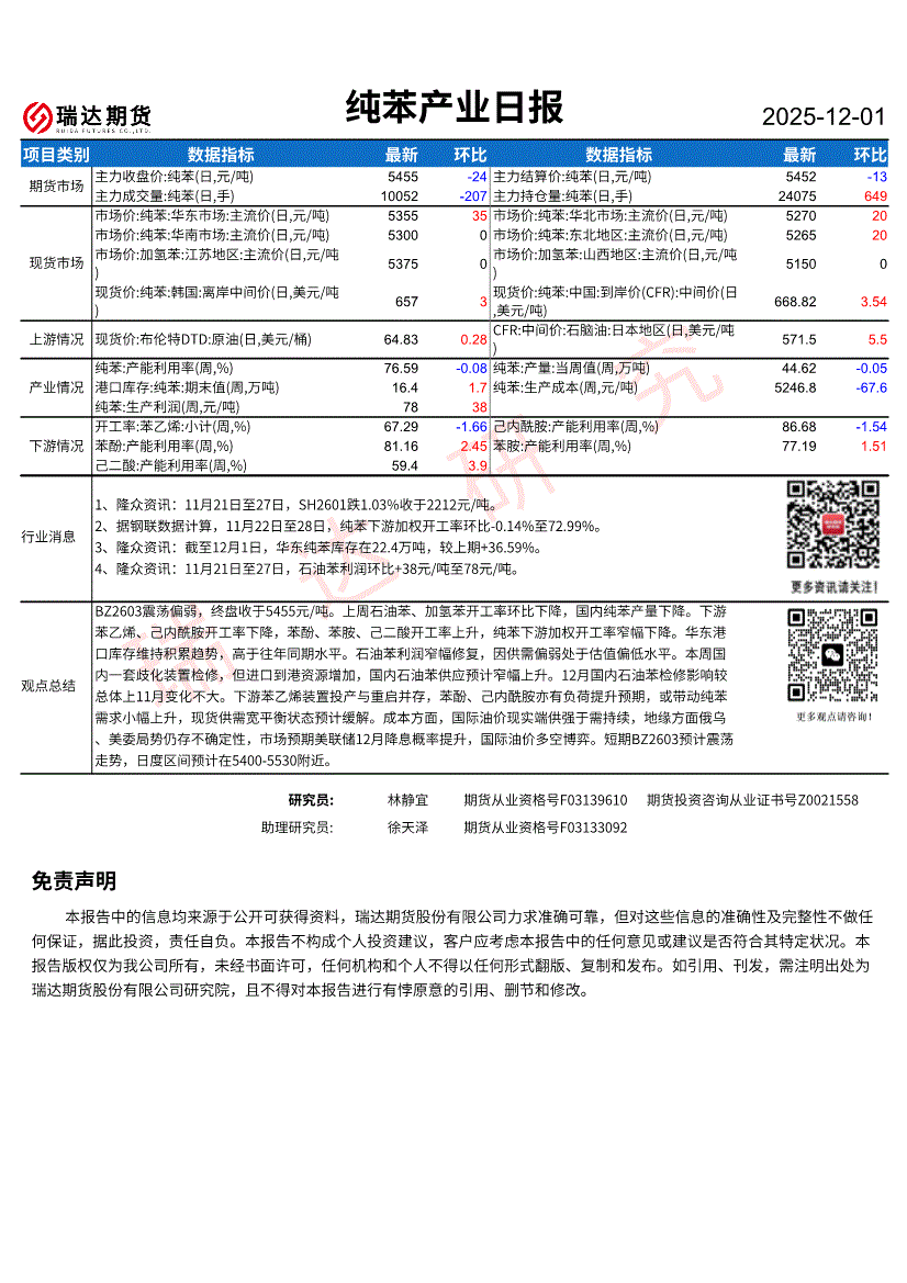 研报:瑞达期货-纯苯产业日报-251201