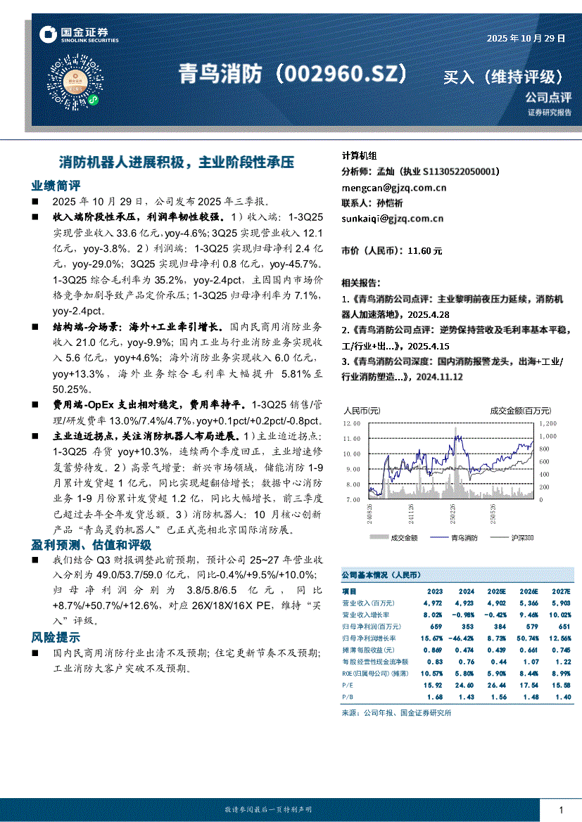 青鸟消防研报:国金证券-青鸟消防-002960-消防机器人进展积极,主业阶段性承压-251029