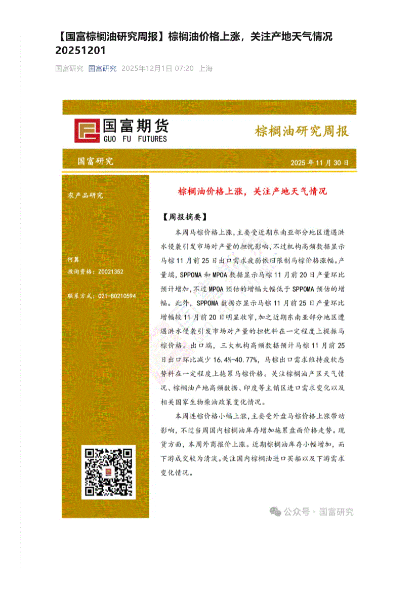 研报:国富期货-棕榈油研究周报:棕榈油价格上涨,关注产地天气情况-251130