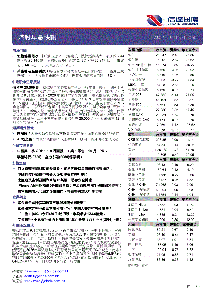 研报:信达国际-港股早晨快讯-251020