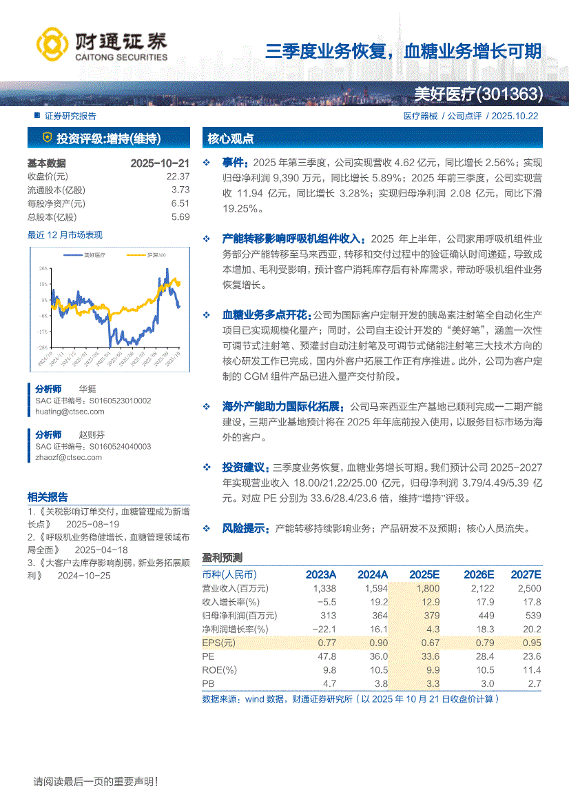 美好医疗研报:财通证券-美好医疗-301363-三季度业务恢复,血糖业务增长可期-251022
