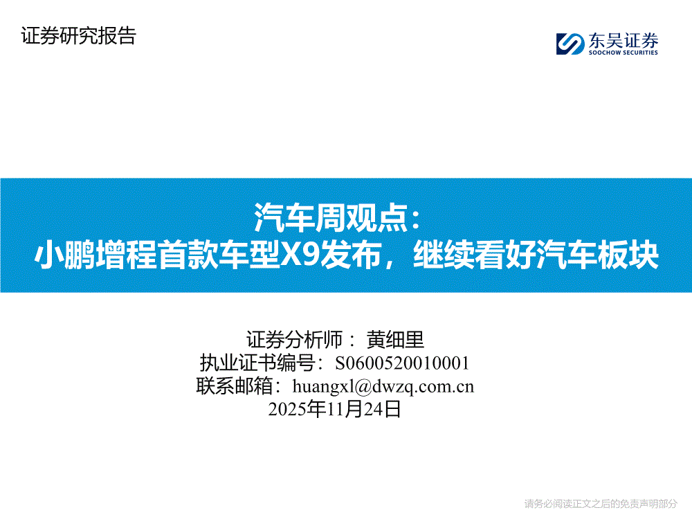 汽车行业研报:金宝搏官网188金宝搏-汽车行业周观点:小鹏增程首款车型X9发布,继续看好汽车板块-251124