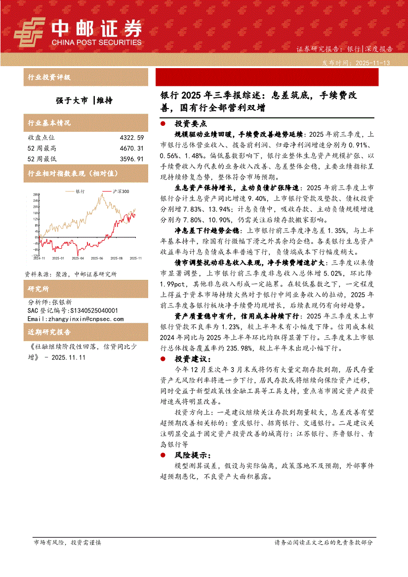 银行业研报:中邮证券-银行业2025年三季报综述:息差筑底,手续费改善,国有行全部营利双增-251113