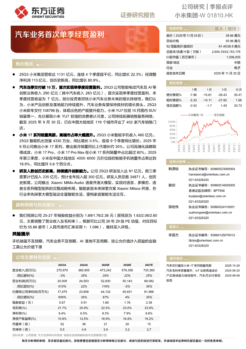 小米集团~W研报:东方证券-小米集团~W-1810.HK-汽车业务首次单季经营盈利-251125