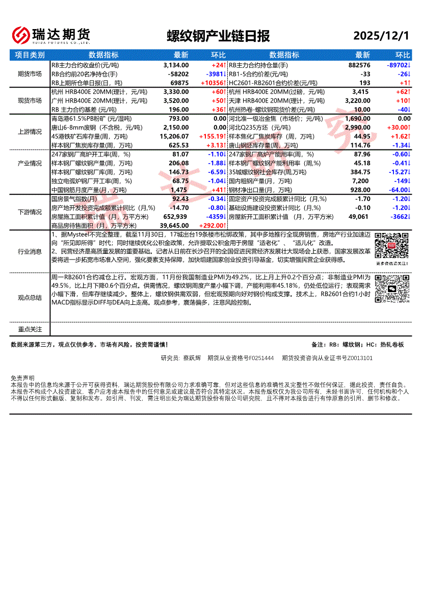 研报:瑞达期货-螺纹钢产业链日报-251201