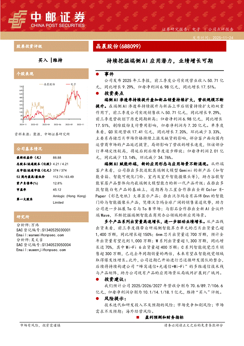 晶晨股份研报:中邮证券-晶晨股份-688099-持续挖掘端侧AI应用潜力,业绩增长可期-251124