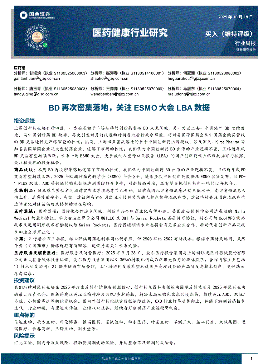 医药健康行业研报:国金证券-医药健康行业周报:BD再次密集落地,关注ESMO大会LBA数据-251018